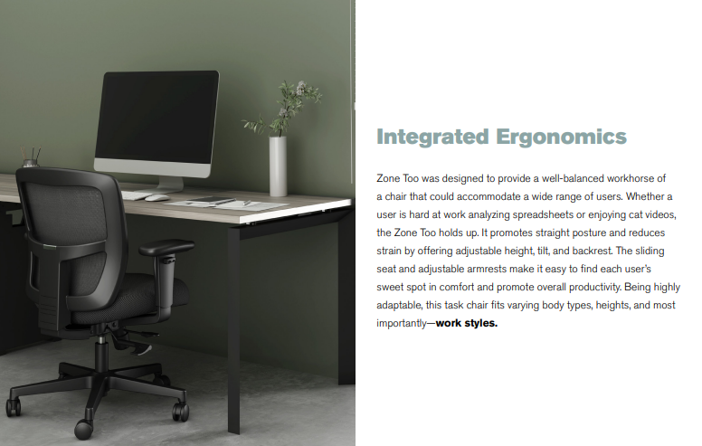 The Friant Zone Too is designed to help you stay focused, comfortable, and supported throughout the day. With highly adjustable features and a balanced ergonomic design, this chair adapts easily to your body and work style – helping you “get in your zone too.”